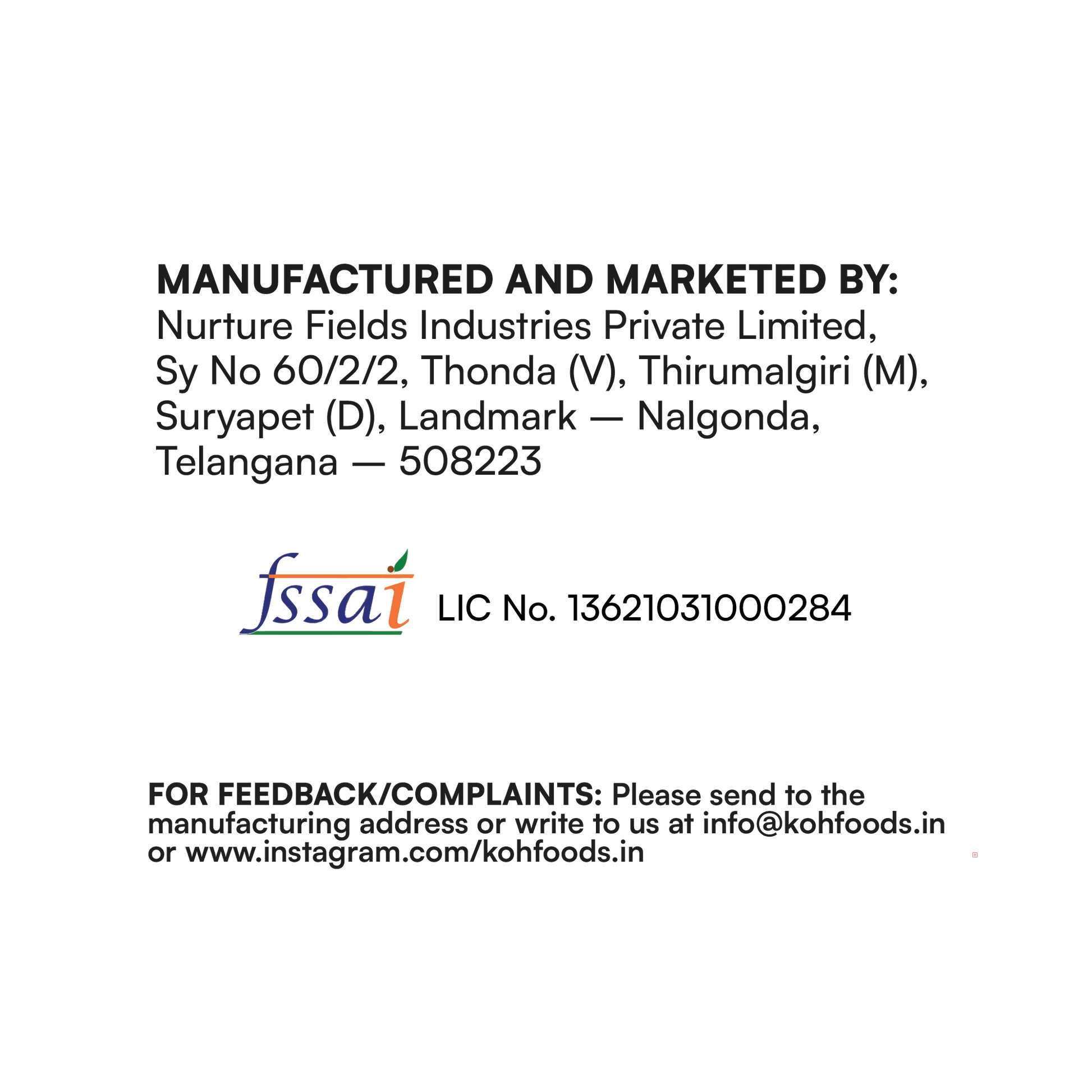 We produce all koh! products at our own factory located in rural Telangana. This allows us to maintain the highest standards of purity and quality. Our products are completely free of preservatives, additives, and artificial colors.