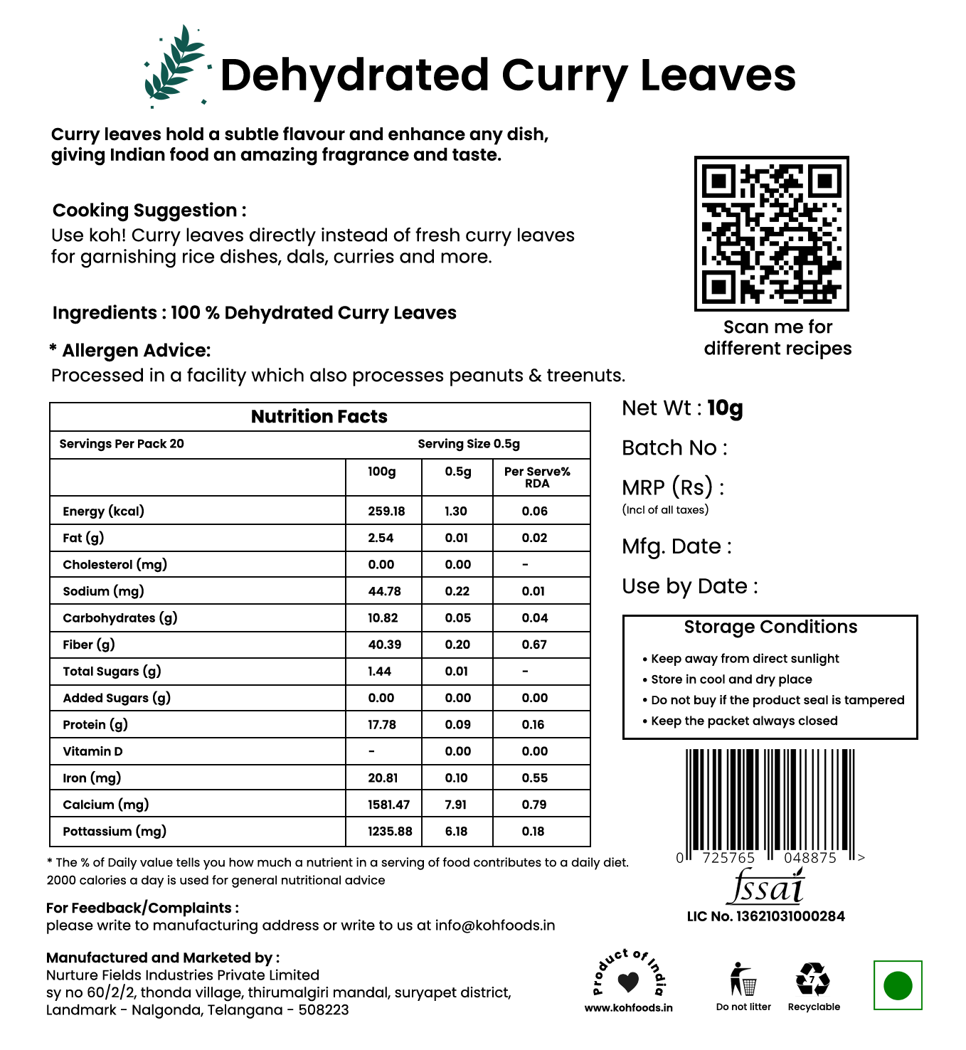Use koh! Curry Leaves directly as a substitute for fresh curry leaves. Add during tempering or directly to curries, chutneys, rasam, sambhar, and other everyday dishes.