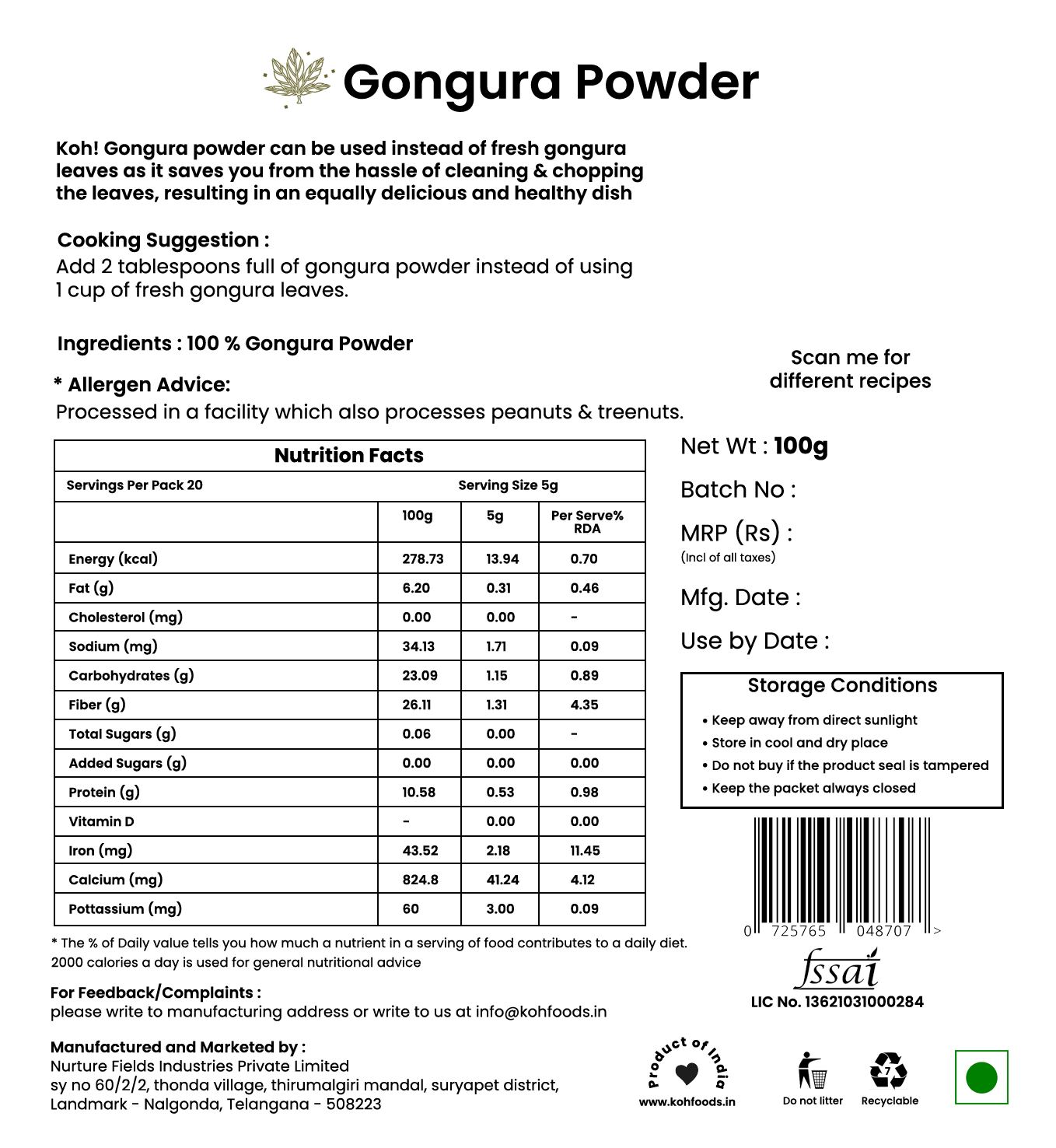 Add 2 tablespoons of gongura powder in place of 1 cup of fresh gongura leaves to bring a naturally tangy flavour to your dishes. Ideal for curries, dals, stir-fries, and gravies.