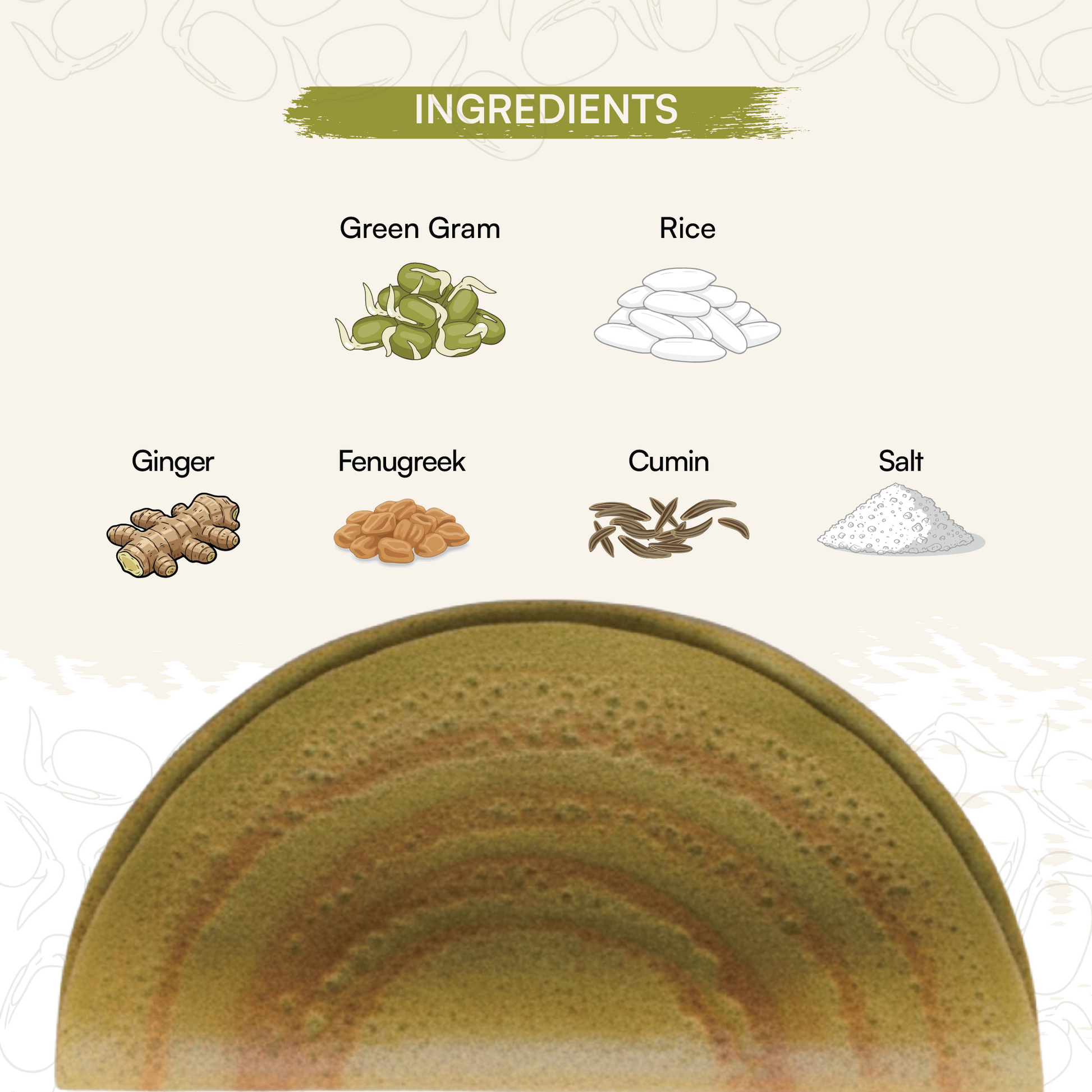 Sprouted & Dehydrated Green Gram, Rice, Ginger Powder, Fenugreek, Cumin & Salt.