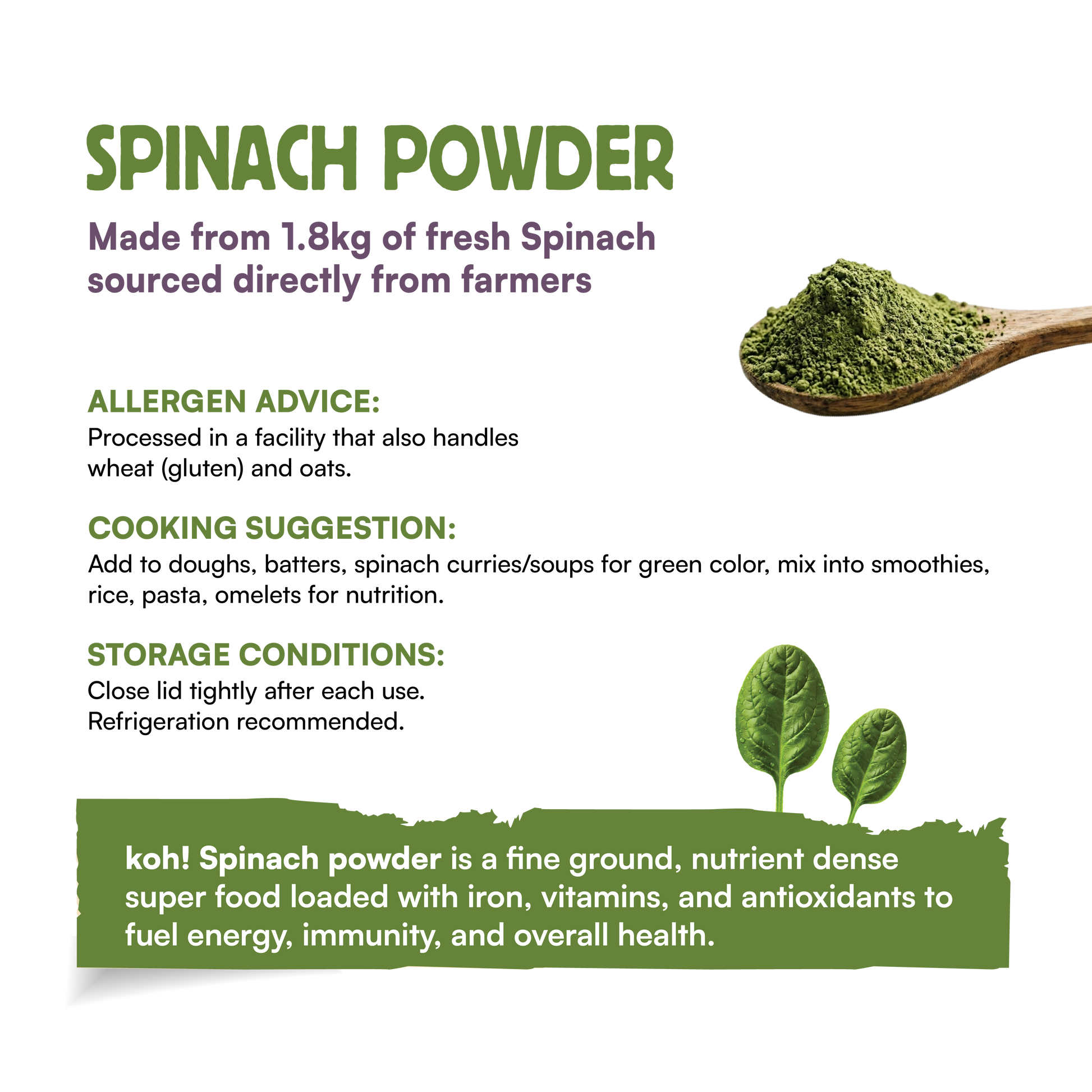 Get your daily dose of Iron and Fiber easily with koh! Spinach powder. Fiber in Spinach helps your body in digesting and expelling the waste. It also helps you in weight loss, lowers your blood pressure, and fights insulin resistance.