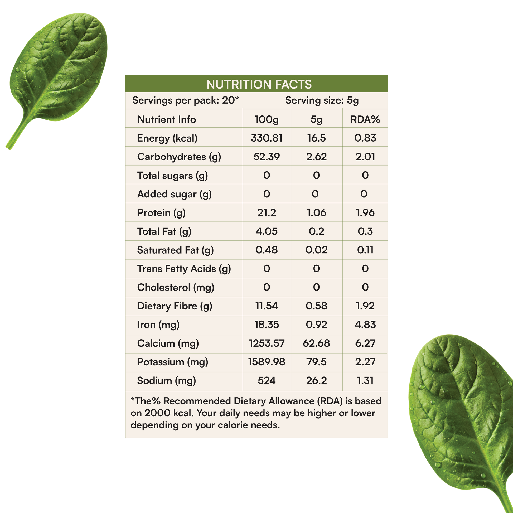 Add 2 tablespoons full of spinach powder instead of a cup full of fresh spinach leaves to everyday curries, rotis, sauces, dressings, dips, omelettes, noodles, pasta etc for an extra boost of nutrients in your diet