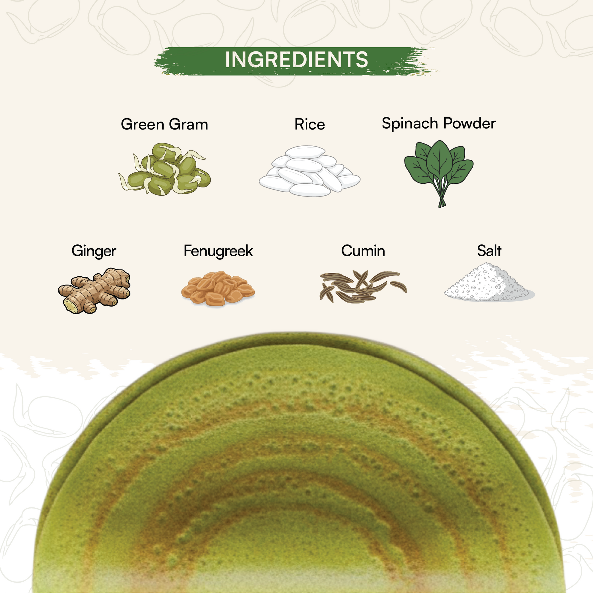 Sprouted & Dehydrated Green Gram, Rice, Spinach Powder, Ginger Powder, Fenugreek, Cumin & Salt.